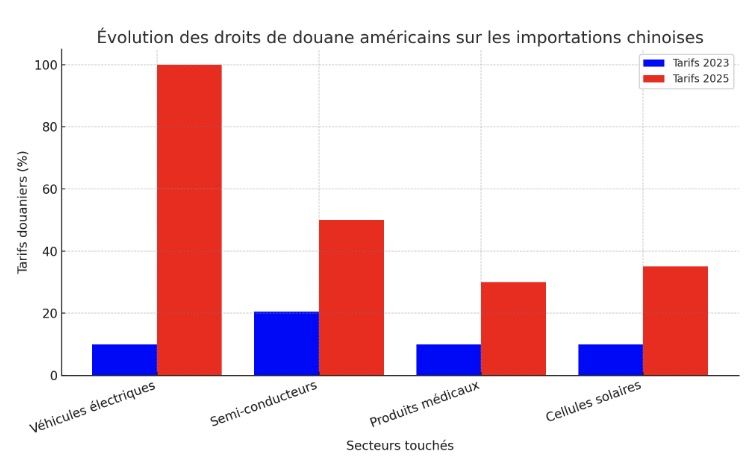 Outre les tarifs de 10 %, des augmentations ciblées ont été annoncées, notamment dans le secteur des véhicules électriques, où les droits de douane ont atteint 100 % à partir de fin 2024. L’objectif est de protéger les marques américaines comme Tesla et Rivian tout en réduisant la dépendance vis-à-vis des fournisseurs chinois.